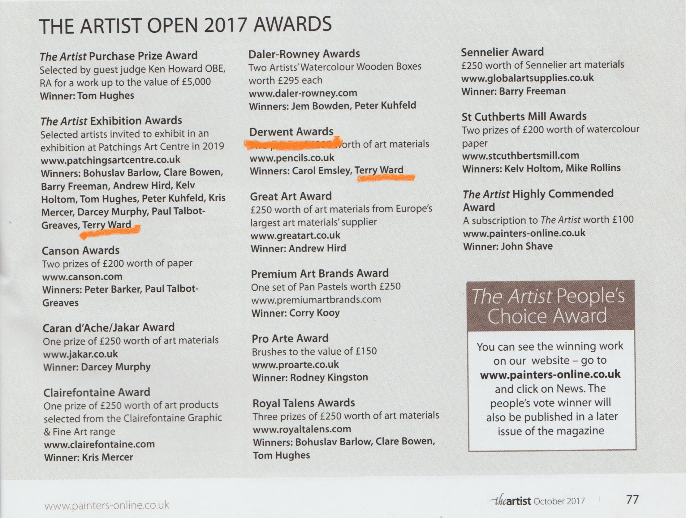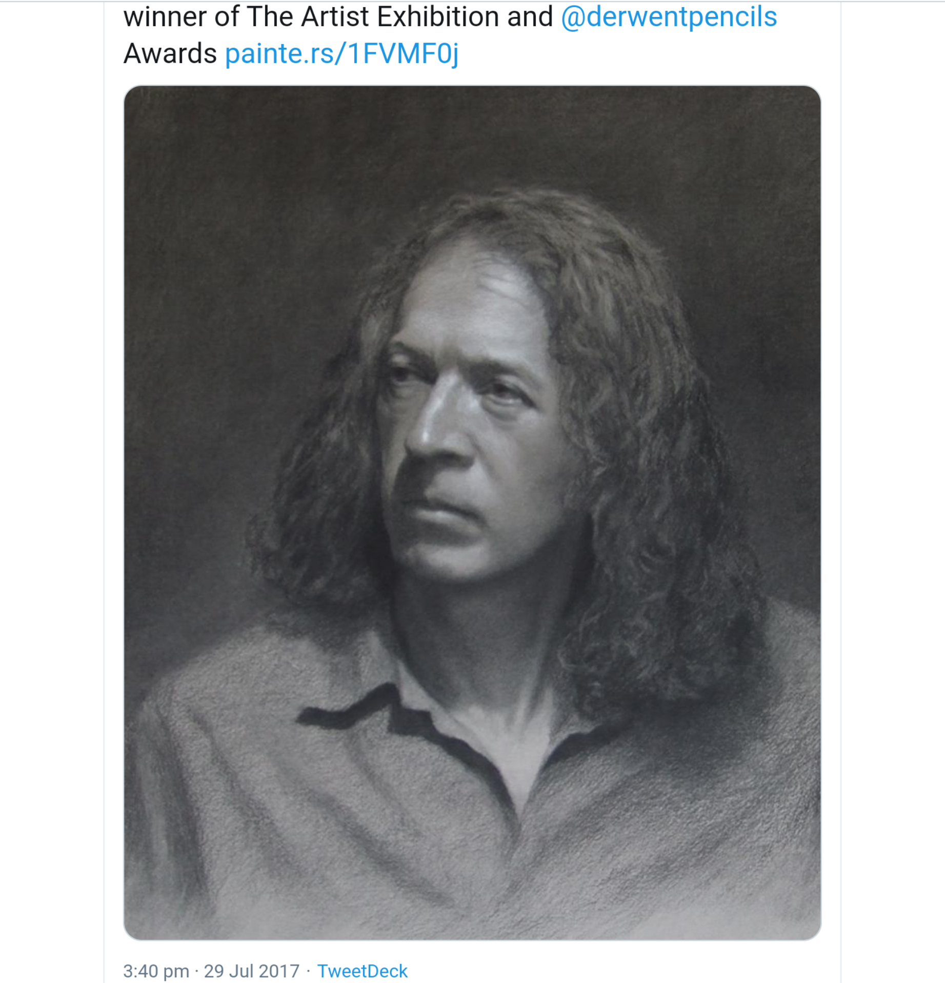 Terry Ward’s charcoal and chalk drawing titled ‘Michael’ won the Derwent Award and the Artist Exhibition Award at the annual open exhibition of The Artist Magazine in July 2017. Painters-Online, the online platform of The Artist Magazine, also mentioned about it on Twitter in July 2017. The picture was exhibited at Patchings Art Centre in Nottinghamshire, United Kingdom.